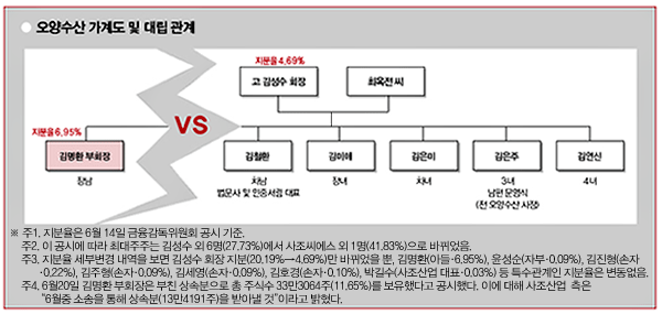 이런 와중에 오양수산 정기주총(6월9일 서울 역삼동 현대해상 사옥)이 진행됐다. 이곳에선 가족간 다툼 외에 오양수산 현 경영진과 사조산업 간 갈등이 적나라하게 표출됐다. 상복을 벗고 의사회 의장 자격으로 진행자로 나선 김 부회장이 2명의 이사 선임안을 내놓자 사조산업이 브레이크를 걸고 나선 것. 결과는 오양수산의 승리. 그러나 이번 주총의 의미는 크지 않다. 오양수산 지분을 절반 가까이 보유한 사조산업이 주주제안을 통해 이사진 교체를 요구할 가능성이 크다. 이 경우 사조산업이 이길 것이 확실시되기 때문이다.