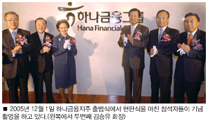 하나금융지주는 하나은행이 충청은행, 보람은행 그리고 서울은행과의 인수합병(M&A)으로 규모를 키운 것이 도약의 발판이 됐다. 1991년 하나은행 창립과 1998∼1999년 충청은행, 보람은행 인수 그리고 2002년 서울은행을 합병했다. 2003년엔 국제 금융전문지 <파이낸스아시아>가 선정한 최고의 기업 M&A 사례로 꼽히기도 했다. 2005년에는 대한투자증권을 거머쥐고, 그해 12월 지주사로 변신했다.