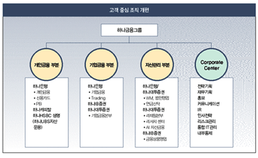 이는 하나은행, 하나IB증권, 하나대투증권 등 각 계열사에 중복된 개인금융, 기업금융, 자산관리 관련 조직을 고객 지향적인 기능별 조직으로 재편했다는 의미다. 동일 사업을 위해 그룹 시너지를 극대화할 수 있는 유기적인 조직 기반을 마련해 가장 고객 지향적인 원-스톱(One-Stop) 금융 서비스를 제공하도록 한 것이다.