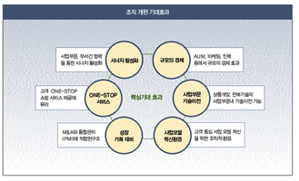 세 가지 기대효과는 첫째, 동일 고객에 대한 상품개발 및 판매기술의 사업 부문 내 상호 교류가 용이해진다. 둘째, 법인별로 분산되어 있는 자산·예산·인력 등의 자원도 기능별로 재조정하여 경비 및 마케팅 측면에서 규모의 경제를 시현한다. 셋째, 그룹 내 동일 사업을 목표로 하는 부서 간 시너지 활성화를 통해 그룹 내 효율성 및 통합된 전문성을 높이는 효과를 기대한다는 것이다.