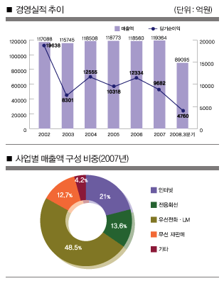 실적 정체는 KT가 짊어진 가장 무거운 짐이다. KT의 매출액은 2002년 민영화 이후 6년째 12조원대의 벽을 넘지 못하고 11조원 중후반을 맴돌고 있다. 올 초 남중수 당시 사장은 12조원 벽을 기필코 넘겠다고 호언장담했다. 하지만 7월 11조9000억원으로 매출 목표를 하향 조정했고, 이 매출 목표 달성도 사실상 물 건너 간 것으로 보인다. 오히려 이동통신 시장을 등에 업고 매년 4000억~5000억원씩 급성장하는 SK텔레콤이 KT를 추월할 분위기다.