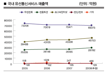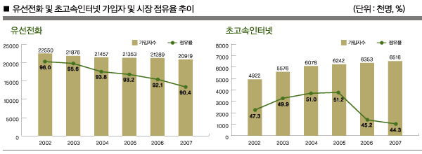 KT 매출의 절반 정도를 차지하는 유선전화 시장은 2001년에 약 8조3000억원에 달하는 최고 성적을 기록한 이후, 2002년부터 2008년까지 줄곧 줄어들고 있다. 연평균 -3.1%의 성장률을 보여, 매년 2000억원씩 줄어든 셈이다. 유무선 대체현상이 절정에 달했던 2003년에는 매출 감소가 5600억원에 달했다.