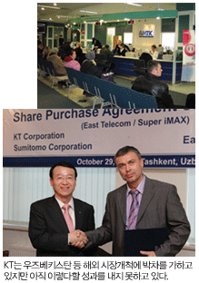 침체의 터널에서 빠져 나오기 위해 최근 KT가 던진 승부수 중 또 하나는 해외 시장 공략이었다. KT는 1990년대 중반부터 국내 통신 시장의 한계를 극복하고 새로운 미래 수익원을 창출하기 위해 적극적으로 해외 시장을 개척해 왔다. 몽골, 베트남뿐만 아니라 러시아와 독립국가연합(CIS), 아시아 등 신흥국가에 대한 공략에 중점을 뒀다. 하지만 우즈베키스탄 와이브로 사업 등에 제동이 걸리면서 해외 사업 확대마저도 뜻대로 움직이지 않고 있다. KT의 전체 매출에서 해외 사업이 차지하는 비중은 2% 내외로 매우 낮다. KT 관계자는 “통신 산업은 대표적인 규제 산업이어서 시장 개척 등에 많은 시간이 걸리는 것이 사실”이라며 “아직 해외 시장에서의 수익성은 미미하지만 차츰 나아질 것”이라고 말했다.