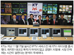 KT의 경우 그동안 문제가 돼 왔던 지상파 방송사간 실시간 TV 프로그램 재전송료 계약이 타결되면서 한 시름을 놓았다. 하지만 요즘같이 어려운 경제상황에서 IPTV 커버리지 확대를 위한 대규모 투자비용을 마련하기는 쉽지 않다. 여기에다 치열한 방송 시장을 뚫고 안착하기에는 시간이 필요하다는 분석이다.