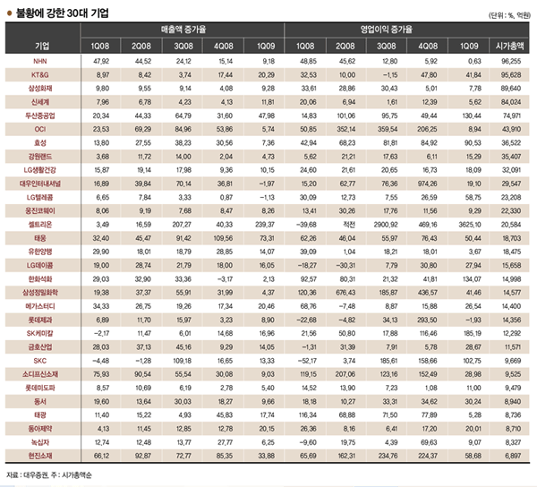 그렇다면 환율 효과의 도움을 받지 않고도 이 불황을, 100년 만의 위기라는 이 난국을 제대로 헤쳐가고 있는 기업은 없을까. 이에 <이코노미플러스>는 진정으로 ‘불황에 강한 기업’을 찾아 나서기로 했다. 기준은 두 가지였다. 지난 1년간 이익은 물론 매출도 줄지 않았거나 늘어났어야 한다는 것이었다. 대우증권의 도움을 받아 상장기업 가운데 성장률이 줄었을지언정 성장세를 멈추지 않은, 설혹 뒷걸음질을 쳤더라도 그 폭이 전년 동기 대비 5% 이내이거나 일시적이었던 시가총액 상위 30개 기업을 가려냈다.