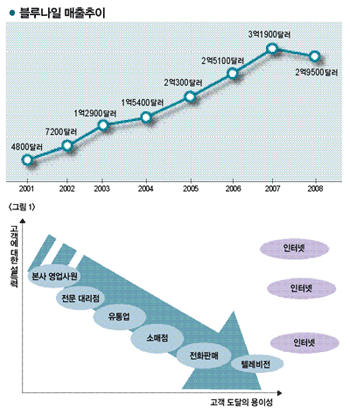 그렇다면 블루나일은 다른 닷컴들과 달리 어떻게 성공을 향해 나아가고 있을까? 우선 이러한 물음에 답하려면 왜 사람들이 다이아몬드반지의 온라인 거래에 회의적일까에 답해야 한다. 지금까지 상품과 서비스의 거래에는 많은 다양한 채널이 활용되어 왔다. <그림 1>에서 보듯 비즈니스가 활용하는 유통채널은 크게 두 개의 특성으로 분류할 수 있다. 고객에 대한 설득력(정보의 윤택성)과 고객 도달의 용이성(채널의 고객당 접근비용)의 차이를 볼 수 있다.