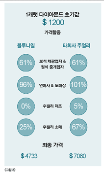 블루나일은 <그림 2>에서 보듯이 1200달러에 생산된 1캐럿의 다이아몬드 원석이 몇 단계의 유통단계를 거쳐서 7080달러짜리로 돌변하는 것에 주목한다. 이 회사는 보석세공업자와의 직거래로 유통단계를 단축해 같은 품질의 상품을 4733달러에 공급하고 있다.