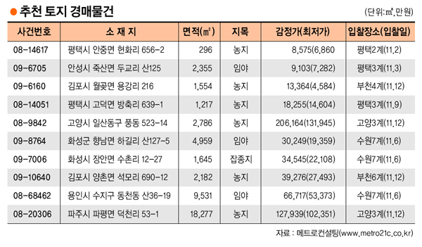 농지와 산지는 싸게 낙찰 받아 전용과 형질변경 과정을 거치면 집을 지을 수 있고 도시화가 진행되는 택지지구 인근 토지는 주택이나 상가를 지을 수 있어 다른 부동산에 비해 활용가치가 높다. 산지와 농지는 다른 토지 종목에 비해 낙찰가율도 낮다.