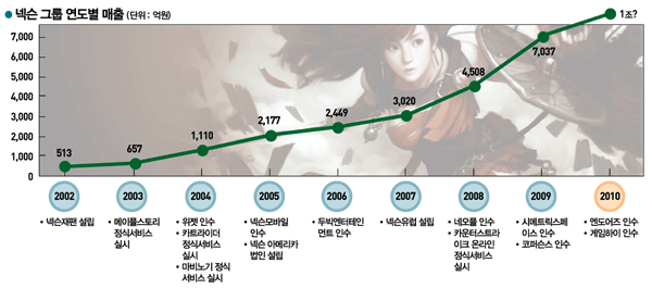 단 한 번의 마이너스도 없이 줄곧 성장해온 기업이 있다. 연평균 성장률 40%의 온라인게임 업체 넥슨이다. 지난해도 사상 최대 실적을 올리며 NHN의 한게임을 제치고 게임 업계 1위로 등극했다. 넥슨의 지난해 연결매출은 7037억원, 전년 대비 성장률은 56%다. 추세대로라면 올해 1조원을 무난히 넘길 것이란 전망이다. 게임 업계에선 넥슨이 본격적인 ‘1조원 기업’ 시대를 열 것으로 기대하고 있다.