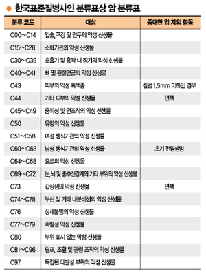 그렇다면 암보험에서 보장하는 범위와 얼마나 차이가 있는 걸까? 도표는 질병분류코드상 암보험과의 차이를 보여준다. 실제로 몇 가지 경우를 제외하면 ‘중대한’이라는 제한은 큰 의미가 없다. 주의할 점은 가입 시기와 회사에 따라 면책 범위가 약간 다를 수 있다는 사실이다. 약관을 분실했다면 해당 회사 홈페이지를 통해 확인해 볼 필요가 있다.