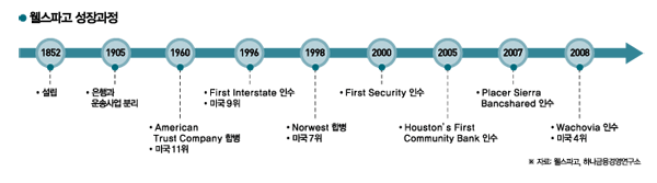 1852년 설립된 웰스파고는 노웨스트(Norwest) 은행과의 합병작업을 성공적으로 완수하면서 본격적으로 성장하기 시작했다. 다른 미국 은행들이 몸집 부풀리기에 힘쓸 때, 당시 CEO였던 코바세비치(Kovacevich)는 ‘클수록 좋은 것이 아니라 좋을수록 커진다’라는 신념하에 ‘웰스파고 웨이’를 고집하며 소매금융을 중심으로 한 미국 일류은행을 목표로 핵심역량 개발에 힘썼다. 최근에는 탄탄한 지역 내 상업은행 업무를 기반으로 투자은행 업무로의 확장을 도모하고 있다.