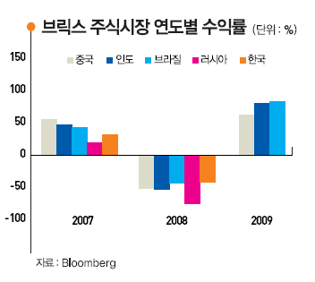 최근의 주가상승은 실적 개선이 아닌 유동성에 의한 불안한 상승이다. 하지만 향후 더블딥(경기가 회복되는 듯하다가 다시 침체되는 것)보다는 경기회복 전망에 무게가 실리고 있는 만큼 적정한 비중으로 펀드투자를 고려할 필요가 있고, 해외의 경우라면 당연히 브릭스가 우선이다. 물론 위험을 배제하고 수익률만을 추구한다면 브릭스 중에서도 제일 성과가 높을 것으로 기대되는 단일 국가에 투자하는 것이 낫다. 하지만 예측이 빗나가면 큰 위험을 초래할 수 있다. 지금처럼 한 치 앞도 내다보기 어려운 불확실성의 시대일수록 분산투자는 기본이다.