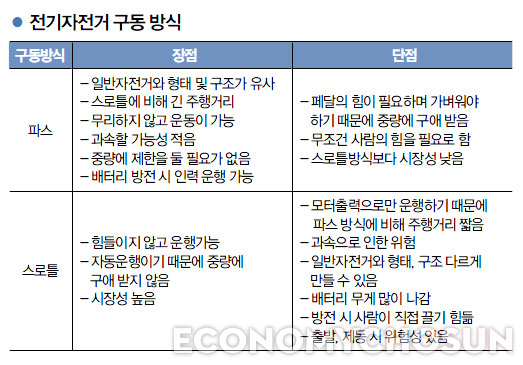 전기자전거 구동방식은 파스(PAS)와 스로틀(Thro-ttle) 두 가지다. 파스 방식이 페달을 구르는 속도에 비례해 전기모터가 돌아가는 것이라면, 스로틀 방식은 핸들을 돌리거나 버튼을 눌러 모터를 돌리는 형식이다. 지역별로는 일본·유럽시장이 파스 방식을, 중국·대만은 스로틀 방식을 주로 사용한다.