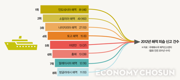 세계 곳곳의 바다 위에서는 해적들에 의한 다양한 약탈 행위가 벌어지고 있는 게 현실이다. 해양수산부의 해양안전종합정보시스템의 통계에 따르면 지난 2003년부터 2012년까지 10년간 발생한 해적 및 무장 강도 건수는 총 3442회다. 아덴만, 소말리아 등 해적 활동이 활발한 아프리카 지역이 이 중 1584회로 46%에 달한다. 하지만 지난해부터 아프리카 지역의 해적출몰이 줄어들고 있는 데 반해, 동남아시아 지역에서의 발생건수가 급증하고 있어 눈길을 끈다. 동남아시아 지역은 2010년부터 차츰 해적 출몰이 잦아지기 시작해 2012년 104건으로 늘었다. 동남아시아 지역에서 해적사고가 크게 늘어난 이유는 최근 인도네시아 지역에서의 해적활동이 활발해졌기 때문. 2012년의 104건 중 81건이 인도네시아 부근 해상에서 발생했으며 이는 2011년(46건)보다 두 배 가까이 늘어난 수치다. 해양수산부 항해지원과의 권혁진 사무관은 “주로 정박 중인 야간에 총기와 도검류로 무장한 해적들이 침입해 계류용 로프 등을 탈취하고 있다”고 설명했다.