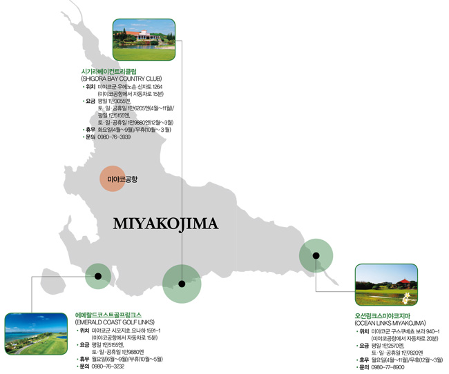 골퍼들이라면 미야코지마의 골프장 한 곳을 골라 라운딩하는 주말여행을 계획해 봐도 좋을 듯하다. 부용범 오키나와관광청 한국사무소장은 “미야코지마의 골프장은 특히 풍광이 아름답고 골퍼들에게 입소문이 난 곳들이 꽤 있다”고 설명했다. 오키나와관광청이 엄선한 세 곳의 명품 골프장을 소개한다.