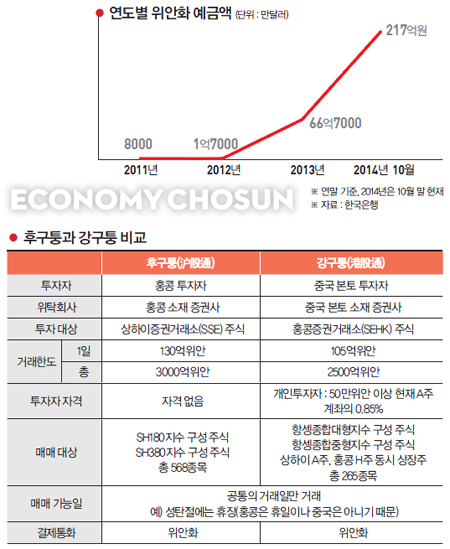 지난 2014년 12월1일 서울 명동 외환은행 본점에서 원·위안 직거래 시장 개장 행사가 열렸다. 이날 행사엔 최경환 경제부총리와 이주열 한국은행 총재 등이 참석했다. 최 부총리는 “원·위안화시장은 큰 잠재력을 가진 새내기 벤처기업”이라며 “이 벤처기업을 세계적 경쟁력을 갖춘 ‘히든 챔피언’으로 길러낼 것”이라고 말했다. 지난 2014년 11월17일 홍콩, 상하이 증시 간 교차거래를 허용하는 후강퉁이 시행된 이래 원·위안 직거래 시장까지 생기면서 중국 투자의 물꼬가 트이고 있다.