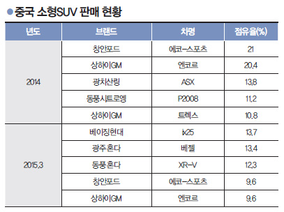 특히 최근 중국 자동차시장 전체를 견인하고 있는 SUV는 지난해 2012년 대비 2배 이상, 2013년 대비 37%나 성장했다. 같은 기간 동안 중국 자동차시장 전체에서 SUV가 차지하는 비중은 14%대에서 23.3%까지 확대됐다.
