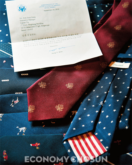 “성조기를 모티브로 해 만들면 미 대사관에서 선물로 쓸 수 있지 않을까 생각했어요. 앞부분에는 별 문양을 넣고, 뒷부분에 빨간색 줄무늬를 넣어서 성조기 문양이 너무 티가 나지 않도록 고급스럽게 만들었습니다. 그때 성김 대사께서 SNS 활동을 활발하게 하시면서 소통을 많이 하시길래 한번 제안해보면 어떨까 하는 생각을 했어요. 권위적인 느낌의 분이었다면 아마 엄두도 못 냈겠죠. 저희 브랜드의 대표적인 상품인 월가를 상징하는 ‘황소넥타이’와 ‘성조기 넥타이’를 미 대사관으로 보내드렸는데, 대사님이 편지를 써서 답장을 보내주셨고 며칠 후에 주문이 들어왔어요. 대사님이 곧 임기가 끝나 대사직을 마치는데 선물용으로 드리고 싶다면서요. 미 대사관의 상징인 독수리 문양과 성조기 문양이 들어간 두 가지 넥타이를 한 세트로 해서 만들어 달라고 하시더라고요.”