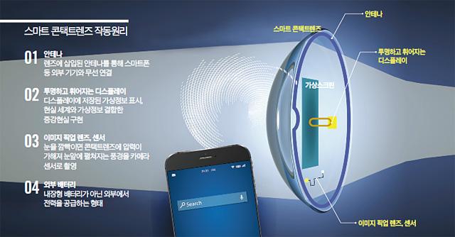 ‘스마트 콘택트렌즈’를 개발하기 위한 기술 경쟁은 2014년 시작됐다. 구글, 삼성전자, 소니는 이미 스마트 콘택트렌즈 관련 미국 특허를 출원한 상태다. 소니의 스마트 콘택트렌즈는 렌즈 내에 투명 디스플레이, 카메라 센서, 압력 센서, 메모리, 프로세서를 집적(集積)한 형태다. 렌즈를 착용한 사용자가 눈을 깜빡이면 콘택트렌즈에 압력이 가해지는데 이를 압력 센서로 감지할 수 있다. 사용자의 의도적인 눈 깜빡임을 감지해 눈앞에 펼쳐지는 풍경을 카메라 센서로 촬영하는 것이다. 또 렌즈에 삽입된 디스플레이에 미리 저장된 가상정보를 표시할 수 있어 가상공간을 즐길 수 있다.