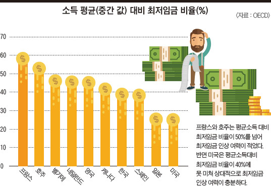 최저임금 인상이 중요한 사회 쟁점이 된 것은 미국만이 아니다. 글로벌 금융위기 이후 세계경제가 저성장 기조로 돌아서면서 소득 불균형이 커진 데 대한 반작용으로 최저임금 인상을 요구하는 목소리가 전 세계적으로 높아졌다.
