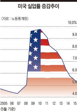 5월 초 발표된 미국의 4월 실업률은 5.0%로 전달과 같았다. 하지만 4월 한 달 동안 새로 생겨난 일자리는 16만개로 시장 전망치인 20만명에 미치지 못했다. 앞서 발표된 일자리 증가폭도 하향 조정됐다.