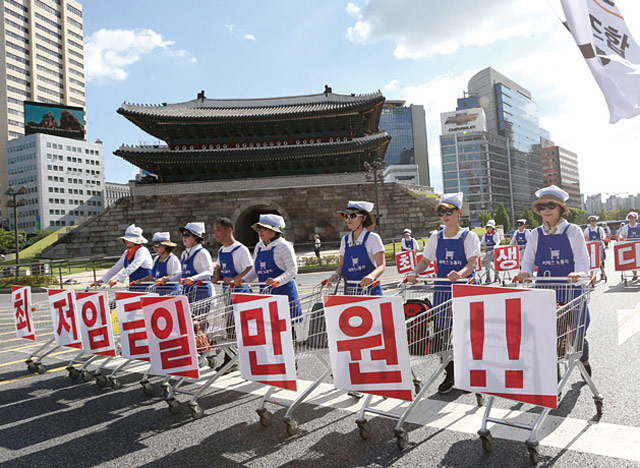올해 최저임금은 6030원이지만 노동계는 ‘최저임금 1만원’을 주요 투쟁 목표로 세우고 서명운동을 벌일 계획이다. 정치권도 힘을 보태고 있다. 새누리당과 더불어민주당은 각각 2020년까지 시간당 최저임금을 8000원, 1만원으로 올리겠다는 공약을 내놨다. 하지만 재계에서는 최저임금이 큰 폭으로 오를 경우 투자와 고용을 위축시킬 수 있다며 반발하고 있다.