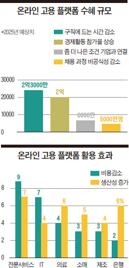 온라인 고용 플랫폼은 고용량을 늘리는 긍정적인 효과를 가져다 줄 가능성이 높다. 맥킨지 조사에 따르면 2025년 전 세계적으로 5억4000만명의 근로자가 혜택을 볼 것으로 전망됐다. 생산가능인구의 10% 수준이다. 이 가운데 2억3000만명은 구직에 드는 시간 감소, 2억명은 경제활동 참가율 상승, 6000만명은 좀 더 나은 조건의 기업과 연결, 5000만명은 채용 과정의 비공식성 감소 등을 통해 각각 혜택을 봤다.