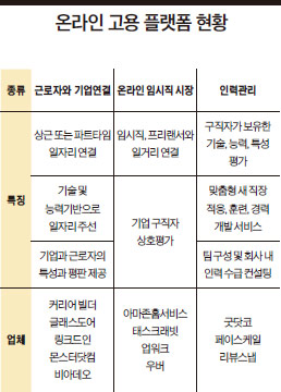 특정 업무나 프로젝트를 수행하기 위해 임시직 근로자들을 연결해주는 형태의 온라인 고용 플랫폼도 빠르게 성장하고 있다. 이러한 유형의 서비스는 아직 이용하는 근로자가 적긴 하지만(미국의 경우 경제활동 인구의 1% 이하) 성장 속도가 주목할 만하다. 전통적인 기업과 스타트업은 이 유형의 서비스를 단기간 전문가를 사용해야 할 때 즐겨 사용한다. 업워크(Upwork·구 이랜스-오데스크)는 전 세계에서 활동 중인 프리랜서들의 자료를 수집해 기업이 원하는 분야의 인력을 연결해준다. 현재 180여개국에서 900만명의 프리랜서와 400만개 기업이 회원으로 가입해 있다. 아예 소비자들을 대상으로 직접 인력을 파견하는 기업들도 있다. 태스크래빗(TaskRabbit), 아마존 홈서비스 등은 심부름 시킬 사람을 찾는 고객과 단기 아르바이트를 찾는 구직자를 연결해준다. 우버(Uber), 리프트(Lyft), 사이드카(Sidecar)는 택시 서비스, 어번시터(UrbanSitter), 케어닷컴(Care.com)은 육아에 특화된 서비스를 제공한다.