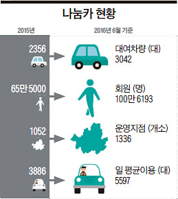 서울 시내 곳곳에서 연두색 무늬가 들어간 자전거를 타고 출퇴근하는 직장인들이 부쩍 늘었다. 지난 7월 회원수 10만명을 돌파한 서울시 공용 자전거 ‘따릉이’다. 반나절 동안 빌려쓰는 공용 자동차 ‘나눔카’도 올 상반기에 회원수 100만명을 돌파했다.