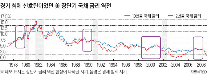 미국의 장단기 국채 금리 차 축소나 역전은 이례적인 현상으로, 경기 침체의 신호로 여겨진다. 한국은행 외자운용원에 따르면, 1980년대 이후 1980년과 1982년, 1991년, 2001년, 2009년, 2020년 등 6차례의 경기 침체 기간에 앞서 모두 장단기 금리 차 역전 현상이 나타난 바 있다. 메들리 글로벌자문의 거시전략가인 벤 에몬스는 블룸버그와 인터뷰에서 “역사적으로 장단기 국채 금리 역전 없이 경기 침체가 일어난 적은 없었다”며 “이러한 현상이 미래의 경기 침체를 예측하는 지표가 된 이유”라고 말했다. 다만 이러한 분석이 과도하다는 의견도 나온다. 공동락 대신증권 연구원은 “1990년대 이후 금리 역전 뒤 경기 침체가 나타났던 국면은 모두 금리가 하락하는 시기에 이뤄졌지만, 이번에는 금리가 상승하는 국면에 나타나고 있다”며 “현시점에서 미국 경제가 침체에 빠질 징후 역시 발견되지 않고 있다”라고 했다.