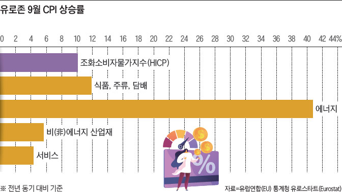 유로존(유로화 사용 19개국) 인플레이션(물가 상승)이 계속 가속화하고 있다. 주범은 에너지 위기다. 지난 9월 유로존 소비자물가지수(CPI)는 전년보다 10% 올라 사상 처음으로 두 자릿수 상승률을 기록했고, 전달 대비로는 1.2% 상승했다. 에너지가 단연 물가를 끌어올린 주범이었고 식품 가격도 크게 올랐다. 9월 에너지 가격은 전년 대비 무려 40.8% 치솟았고, 전달 대비로는 3% 상승했다. 식품 가격은 전년보다 11.8%, 전달 대비 1% 각각 올랐다. 변동성이 높은 식품과 에너지를 제외한 근원 물가는 전년 대비 4.8%, 전달보다 1% 각각 상승했다. 이는 역대 최고 수준이지만 여전히 다른 국가에 비하면 낮은 편이다.
