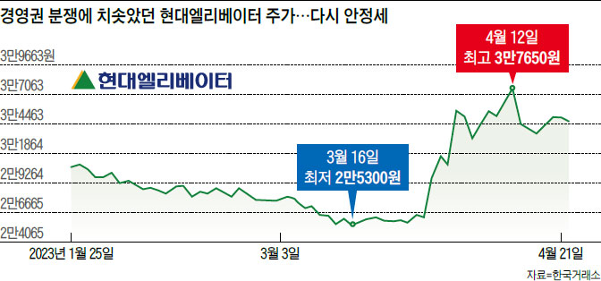 현대엘리베이터는 2021년 1290억원이었던 영업이익이 지난해 430억원으로 대폭 줄었다. 아파트 분양이 늘면서 매출이 7.9% 늘어난 상황에서도 점유율 하락으로 인해 물류비, 원재료비 인상분을 전가하지 못했기 때문으로 풀이된다. 업계에 따르면 지난해 현대엘리베이터 승강기 신규 설치 대수는 1만2731대로, 점유율이 38.90%를 차지했다. 2위와 3위는 티케이와 오티스로 각각 26.5%, 12.5%의 점유율을 기록했다. 현대엘리베이터가 선두이긴 하나 한때 50%에 달했던 점유율이 계속 낮아지고 있다는 점이 부담 요인이다. 한 펀드매니저는 “현대엘리베이터는 2021~2022년 실적 대비 현재 주가가 글로벌 승강기 업체와 비교해도 비싼 수준”이라며 “현재도 경영권 분쟁 기대감이 녹아 있는 상태라 쉰들러의 대응 수위에 따라 주가가 움직일 것”이라고 내다봤다.