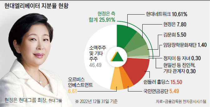 현대엘리베이터는 현대네트워크가 10.61%의 지분을 보유하고 있고, 현 회장과 현 회장의 모친인 김문희 여사가 각각 7.80%, 5.50%를 들고 있다. 최대 주주 측 지분을 모두 합치면 25.91% 정도 된다. 반면 쉰들러는 15.50%의 지분을 보유하고 있고, 국민연금공단이 5.49%, 오르비스 인베스트먼트라는 다국적 펀드가 6.61%의 지분을 보유하고 있다. 일각에서는 쉰들러가 오르비스와 손잡고 함께 경영권 참여를 노릴 가능성이 있다는 전망을 내놓는데, 아직 구체화된 것은 없는 것으로 알려졌다.