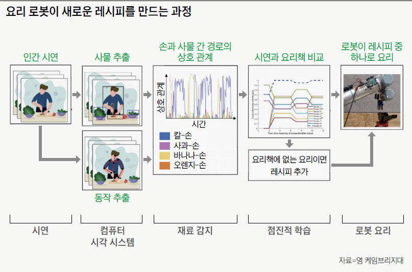 로봇은 동영상을 보고 요리도 배웠다. 영국 케임브리지대의 후미야 이이다(Fumiya Iida) 교수 연구진은 최근 미국전기전자공학회(IEEE)가 발간하는 학술지에 로봇 요리사가 동영상을 보고 요리법을 배우는 데 성공했다고 밝혔다. 케임브리지대 연구진은 먼저 로봇에 8가지 샐러드 레시피(recipe·요리법)가 담긴 요리책을 입력했다. 연구진은 로봇이 샐러드에 들어가는 과일과 채소를 식별할 수 있도록 AI를 탑재했다. 이후 로봇은 사람이 그중 한 레시피로 샐러드 만드는 동영상을 보고 바로 어떤 레시피인지 파악해 그대로 만들 수 있었다. 로봇은 컴퓨터 시각 시스템으로 동영상을 분석해 칼과 재료뿐 아니라 사람의 손동작도 파악했다.