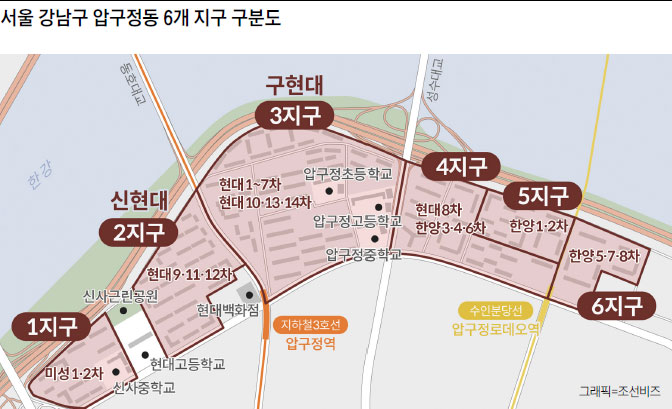 서울 강남구 압구정동을 설명하는 수많은 수식어다. 압구정동은 △1지구(미성 1·2차와 신사중학교) △2지구(현대아파트, 공영주차장, 현대백화점) △3지구(동호대교와 성수대교 사이 현대아파트, 구정초·중·고교) △4지구(현대 8차, 한양 3·4·6차 아파트) △5지구(한양 1·2차 아파트) △6지구(한양 5·7·8차 아파트)로 나뉜다. ‘신(新)현대’로 불리는 곳이 2지구, ‘구(舊)현대’라고 불리는 곳은 3지구다. 따라서 통상 ‘압구정 재건축’이라고 하면 신현대와 구현대를 아우르는 지역을 말한다.