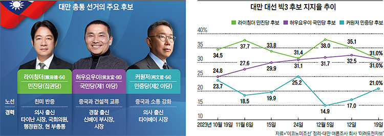 ‘청룡의 해’로 불리는 2024년 갑진년(甲辰年)은 전 세계 42억 명의 인구를 포괄하는 76개국 국민들이 투표권을 행사하는 ‘슈퍼 선거’의 해다. 정부 지도자를 선출하거나, 의회를 새로 구성하는 전국 단위의 선거가 치러지는 나라는 40여 개국이 넘는다. 용맹과 지혜의 상징 그리고 변화와 새로운 시작의 기운을 가져오는 신수로 여겨지는 청룡의 해에 세계 질서를 바꿀 수도 있는 선거가 연달아 예정돼 있다. 2024년 첫 선거는 1월 13일 ‘대만 총통 선거’다. 반중(反中) 정서를 등에 업고 2016년 선거에서 승리한 차이잉원 총통 취임 이후 8년간 대만을 이끌었던 민진당이 3연속 집권에 성공할지 전 세계가 주목하고 있다. 대만 총통 선거는 중국과 대만의 ‘양안(兩岸) 관계’와 미국의 ‘대중(對中) 디리스킹(Derisking·위험 제거) 전략’ 등의 방향성을 결정할 수 있어, 11월 미국 대선까지 영향을 끼칠 수도 있다.