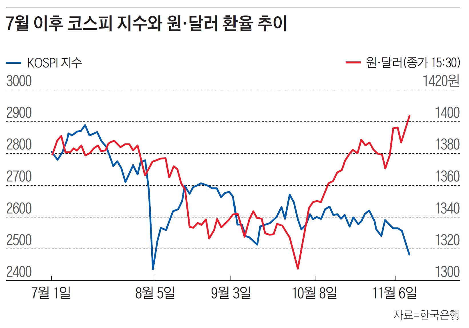 이같이 가파른 원화 약세는 외국인 주식 매도와 맞닿아 있다. 한국거래소에 따르면, 8월 1일부터 11월 11일 사이 외국인은 코스피에서 15조630억원가량을 순매도했다. 7월 11일 2891.35까지 올랐던 코스피 지수는 외국인 매도 폭탄이 쏟아지면서 미 대선 이후 2500 아래로 떨어졌다. 국내 시가총액 1위인 삼성전자 주가는 이 기간 최고 8만300원(8월 16일)에서 4만9900원(11월 14일)까지 석 달 동안 40%가량 떨어졌다. 외국인이 삼성전자 주식을 16조원 이상 순매도하면서 유례 없는 주가 급락이 발생한 것이다.
