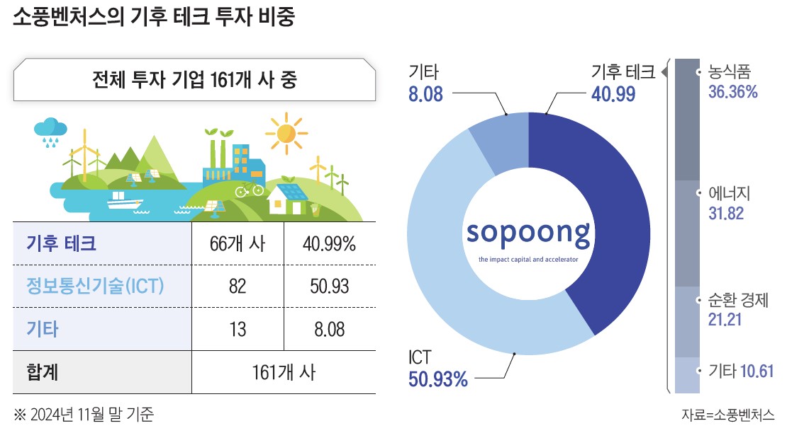 국내에서는 사회적 가치와 함께 수익 창출을 추구하는 임팩트 투자사 중심으로 기후 테크 투자가 진행되고 있다. 대표적인 투자사가 소풍벤처스다. 소풍벤처스는 2020년 말 국내 최초로 기후 테크 기업에 투자하는 펀드를 결성하며 생태계 조성에 나섰다. 지난 3년 동안 투자 금액의 절반을 기후 테크 기업에 쏟는 등 시장 활성화를 위해 움직이고 있다.