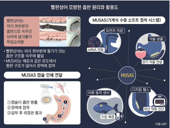 단백질이나 유전물질은 위장관에 흡수되기 전에 분해돼 먹는 약 방식으로 투여하기 어렵다. 매번 병원에 가서 오랫동안 정맥주사를 맞아야 한다. 또 소화기관은 표면이 미끄러운 점막으로 덮여 있어 의료 기기를 붙이기 힘들다. 빨판상어를 모방한 인공 흡반은 아무 문제 없이 위벽에 달라붙어 수일에서 수 주 동안 천천히 약물을 방출할 수 있다.