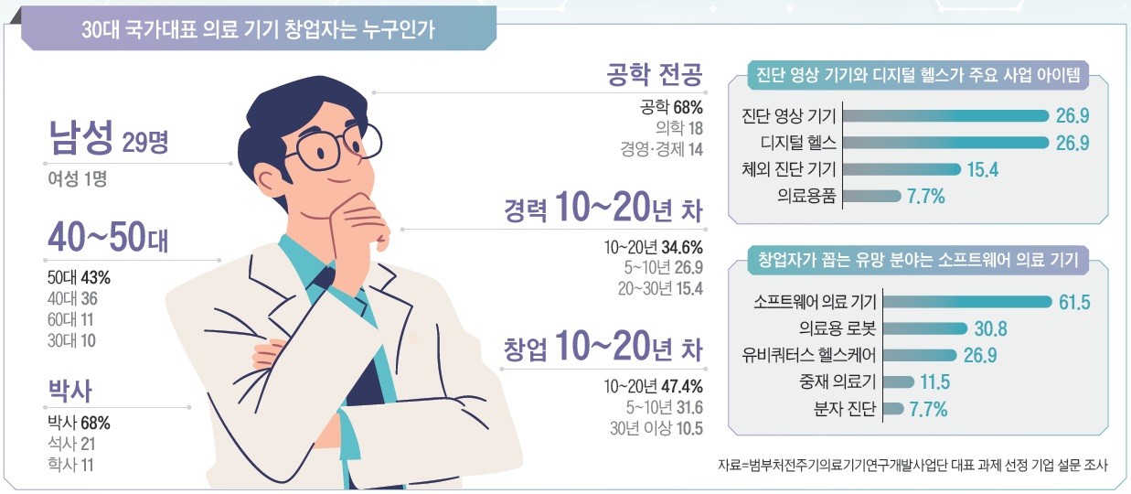 의료 기기 창업에 관한 관심은 점점 커지고 있다. 2024년 10대 대표 과제에 선정된 진씨커는 혈중 DNA로 극초기 암을 진단하기 위해 임상 의사와 엔지니어가 공동 창업한 대표 기업이다. 진씨커 공동 창업자인 허준석 의료책임자(고려대 안암병원 정밀의학센터장)는 “평생 혼자 수술해서 살릴 수 있는 사람이 수천 명도 되지 않는다는 사실에 고민이 많았다”며 “정밀한 암 진단을 통해 더 많은 환자를 살릴 수 있다고 보고, 기술을 보유한 엔지니어와 함께 회사를 만들었다”고 말했다. 김법민 사업단 단장은 “사업단 출범 이후 다양한 성공 사례가 나타나고, 공학자와 의사 창업이 눈에 띄게 늘었다”고 말했다. 하지만 국가대표급 의료 기기 기업도 고민이 많다. 사업단이 대표 과제 기업을 대상으로 진행한 설문에서 조사에 응한 30개 기업 중 20개 기업이 최근 1년 새 매출에 큰 변동이 없다고 답했다. 인허가 제도의 잦은 변화와 강화로 의료 기기 R&D 기간이 길어졌다고 호소하는 기업이 가장 많았다. 개발된 의료 기기를 임상 현장에 빠르게 확산하기 위한 제도 개선과 인허가 획득을 위한 지원이 필요하다는 답변도 많았다. 이는 국산 의료 기기 보급에 더 많은 지원이 필요하며 심사 기간 단축, 수가 개선을 위한 규제 개선에 더 큰 노력이 필요한 것으로 풀이된다.