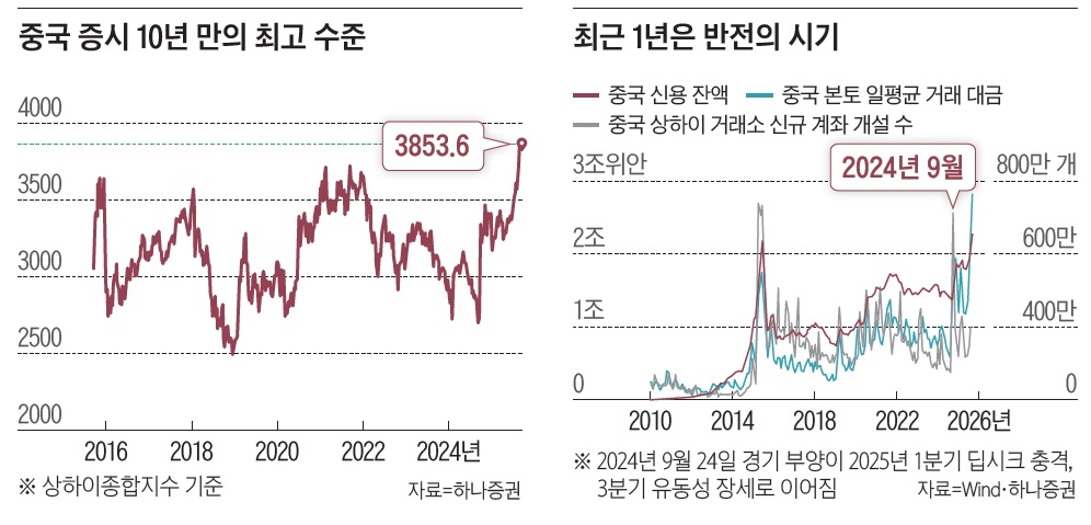 중국 본토 대표 주가지수인 상하이종합 지수는 8월 20일 3751을 찍으며 2015년 8월 7일 3744를 기록한 이후 10년 만에 최고치를기록했다. 상하이종합 지수는 다시 8월 25일 3883을 찍으며 기록을 갈아치웠다. 이는 도널드 트럼프 미국 대통령이 중국에 대해 일방적 상호 관세를 부여하면서 올 들어 주가가 가장 하락했던 4월 7일(3096)보다 25%가량 높다. 상하이종합 지수는 현재도 3800대를 오르내리며 상승세를 이어가고 있다. 같은 기간 기술주 중심의 선전종합 지수도 4월 이후 연일 상승세를 이어가고 있다. 홍콩 상장 중국 빅테크(대형 정보기술 기업)로 구성된 항셍테크 지수는 올 들어 9월23일까지 41.5% 급등했다. 미국 기술주를 대표하는 나스닥 지수의 같은 기간 상승률(17%)의 두 배를 웃돈다.