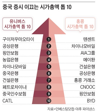 중국 주식시장은 본토와 홍콩 시장으로 구분된다. 본토 시장에는 상하이·선전·베이징 거래소가 있다. 이들 거래소에 약 56 00개 기업이 상장돼 있다. 베..