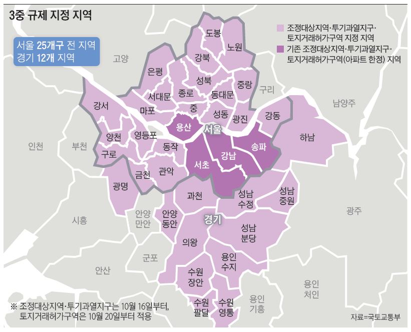 정부가 수도권 주택 시장 과열 양상을 막기 위해 칼을 빼 들었다. 서울 전역과 경기 12개 지역을 조정대상지역·투기과열지구(규제 지역), 토지거래허가구역(토허 구역)으로 지정한 것이다. 규제 지역은 10월 16일부터, 토허 구역은 10월 20일부터 규제가 시행됐다. 6·27 대출 규제와 9·7 공급 대책에 이어 4개월 만에 나온 이번 정부 세 번째 대책이다.