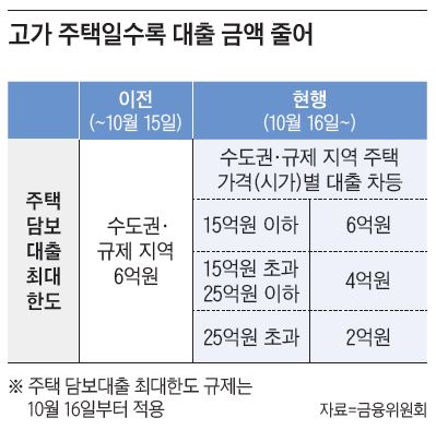 또 수도권·규제 지역의 시가 15억원 초과, 25억원 이하 주택은 주택 담보대출(주담대) 한도가 4억원, 25억원 초과 주택은 2억원으로 각각 줄어든다. 비싼 집을 살수록 대출이 줄어들어 더 좋은 집이나 넓은 집으로 갈아타기가 어려워지는 셈이다.