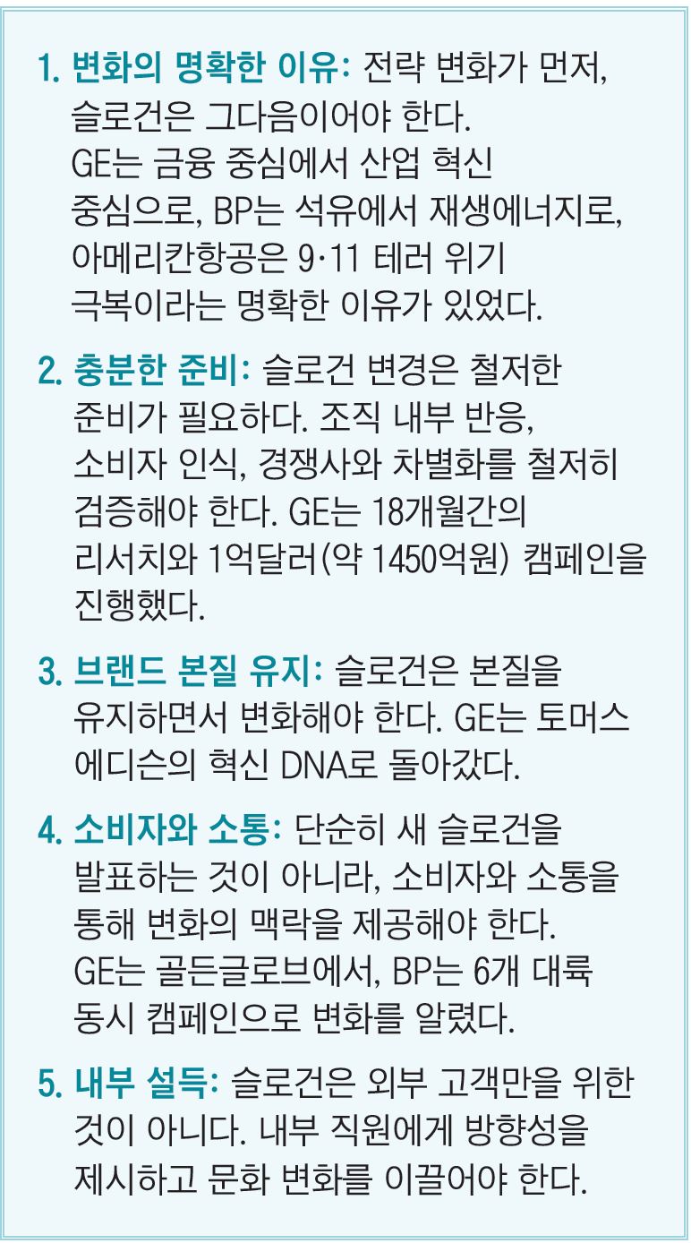 슬로건 변경이 성공하기 위해서는 변화의 이유와 준비 과정이 중요하다. GE, BP, 유니레버는 각각 사업 전략의 변화에 맞춰 슬로건을 변경했고 그 변화는 브랜드의 본질을 바탕으로 이루어졌다.