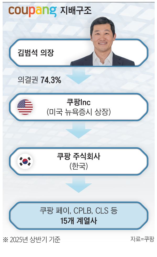 쿠팡의 지배구조는 미국 델라웨어주에 본사를 둔 모회사 쿠팡Inc가 한국 사업 법인인 쿠팡㈜ 을 100% 소유하는 형태다. 김 의장은 일반 주식의 29배에 달하는 의결권을 가진 ‘클래스 B’ 주식을 통해 전체 의결권의 76.7%를 장악하고 있다. 이사회의 어떤 결정도 김 의장의 뜻을 거스를 수 없는 구조라는 얘기다. 김 의장은 쿠팡Inc 상장 직후인 2021년 6월 17일 쿠팡㈜ 의 등기이사 및 이사회 의장직에서 모두 사임했다. 이천 덕평물류센터 화재 사고가 발생한 지 5시간 만에 김 의장의 사임 사실이 알려졌다. 현재 그는 미국 쿠팡Inc의 의장 겸 최고경영자(CEO) 직함만 유지하고 있어 한국 내 실질적인 지배력은 유지하되, 중대재해처벌법이나 개인정보보호법 등 국내법상 형사책임에서는 벗어나 있는 상태다.