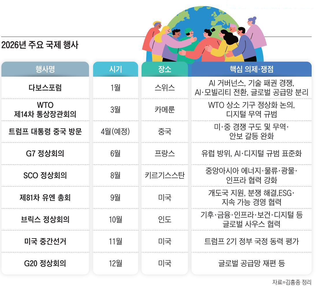 2026년 정상급 국제 행사는 “규범의 와해와 영향권의 부상 속에서, 선택과 준비가 전략의 핵심”이라는 점을 다시 일깨워 준다. 공급망 분리 가속에 대비한 이중화 전략, 정치· 규제 리스크 관리 체계의 고도화, AI·디지털· 기후 규범의 변화에 대한 상시 모니터링, 글로벌 사우스 시장 전략, 기후, 에너지, 모빌리티 전환의 가속화 대응 등 여러 이슈에서 2026년 국제 행사는 그 복잡성을 읽어낼 수 있는 가장 중요한 지도가 될 수 있다.