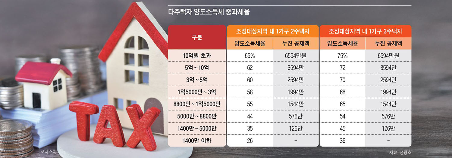 2026년 5월 9일 이후에 다주택자 중과 세율 적용 유예가 종료되면, 규제 지역(조정대상지역 및 투기과열지구)으로 기존에 지정돼 있는 강남구, 서초구, 송파구, 용산구 네 개 자치구와 그 외 서울 21개 자치구 전체와 과천시, 광명시, 성남시 분당구·수정구·중원구 등 경기도 12개 지역의 다주택자는 양도소득세 중과세를 피하기 어려울 전망이다. 따라서 규제 지역의 다주택자는 2026년 5월 9일 이전에 보유 주택을 매도해야 양도소득세 중과를 피할 수 있다. 그러지 않으면 엄청난 세금 폭탄을 피할 수 없다. 왜냐하면 다주택자 양도소득세가 중과되지 않을 때보다 중과되는 경우 매도자의 양도소득세 부담은 약 두세 배가량 늘어날 것으로 보이기 때문이다.