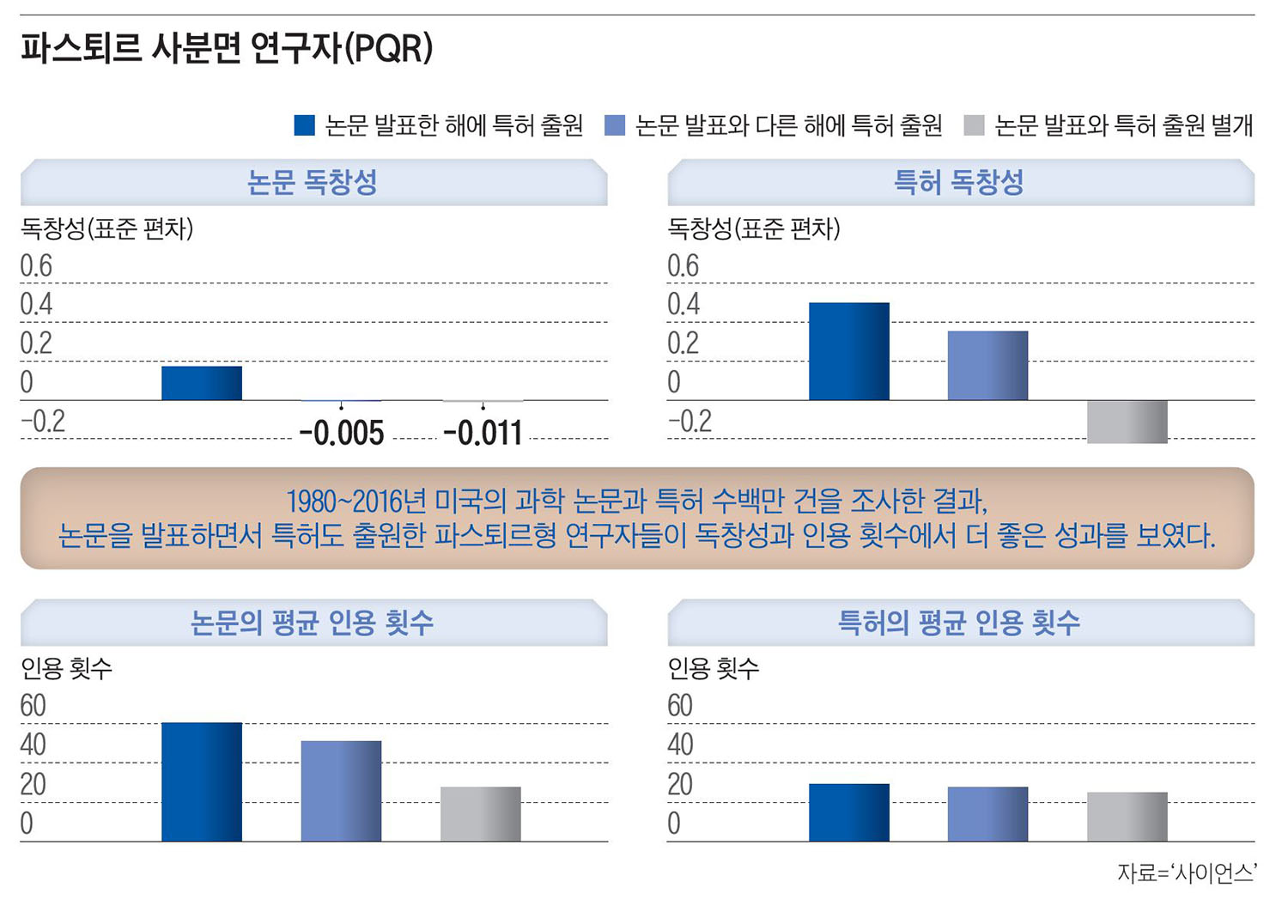 한국이 제2, 제3의 김진수 교수를 배출해야 과학에서 세계 선두가 될 수 있다는 조사 결과가 나왔다. 지난 반세기 과학은 김 교수처럼 기초연구를 하면서 동시에 특허도 출원하는, 이른바 ‘파스퇴르 사분면 연구자(PQR· Pasteur’s quadrant researcher)’가 주도했다는 것이다. 연구에만 집중해야 우수한 논문을 쓸 수 있다는 기존 생각과 달리, 특허도 출원하며 응용을 같이 생각한 과학자들이 독창적이고 인용 횟수가 더 많은 논문을 발표한 것으로 나타났다.