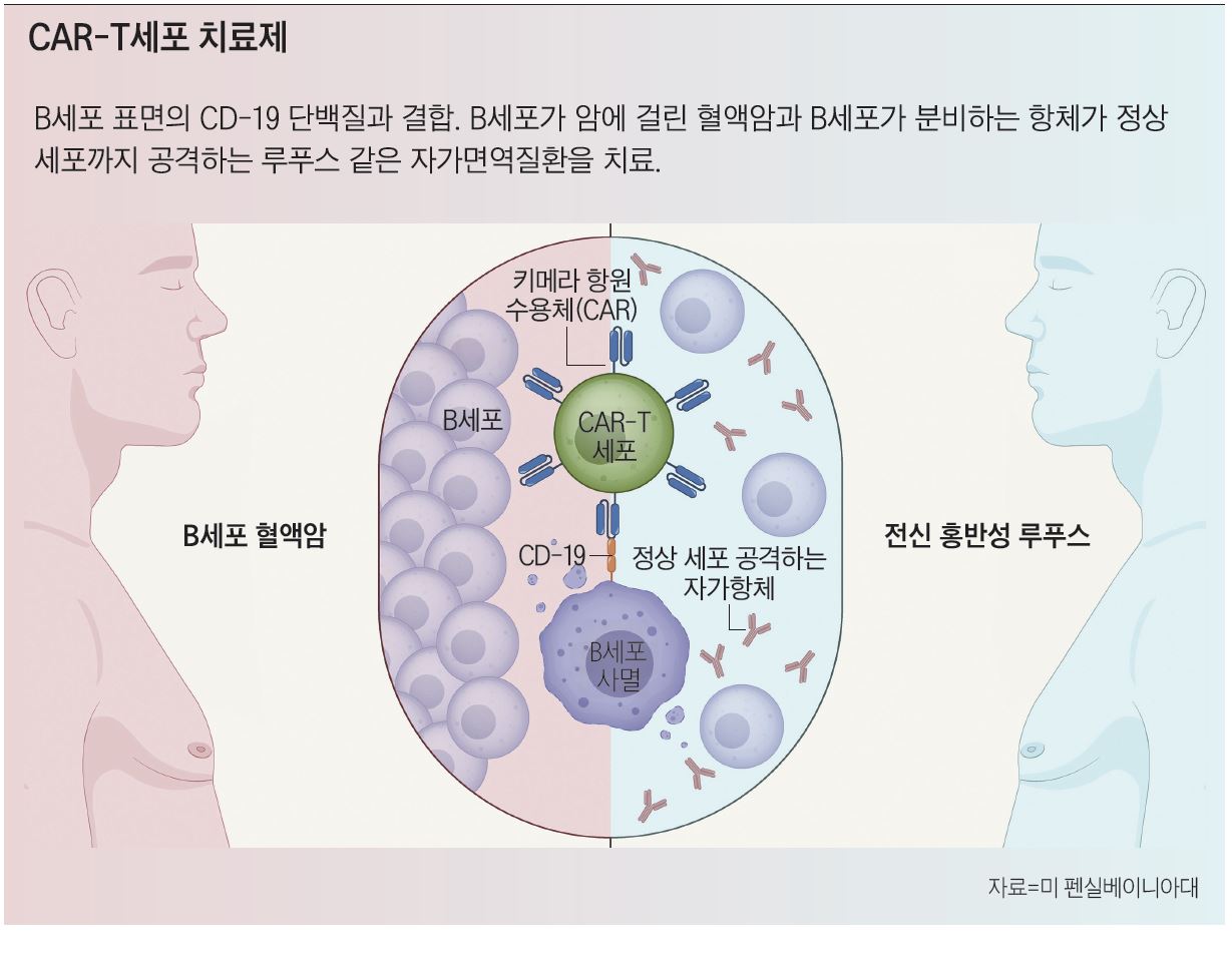 11월 21일 보건복지부는 ‘2025년 제11차 첨단 재생 의료 및 첨단 바이오 의약품 심의위원회’에서 임상 연구 8건 가운데 3건을 ‘적합’으로 의결했다고 밝혔다. 그중 하나가 소아·청소년 난치성 전신 홍반성 루프스(SLE) 환자를 대상으로 CD-19 카티(CAR-T)세포를 투여하는 임상시험이다. 나머지는 줄기세포 치료제 연구였다.